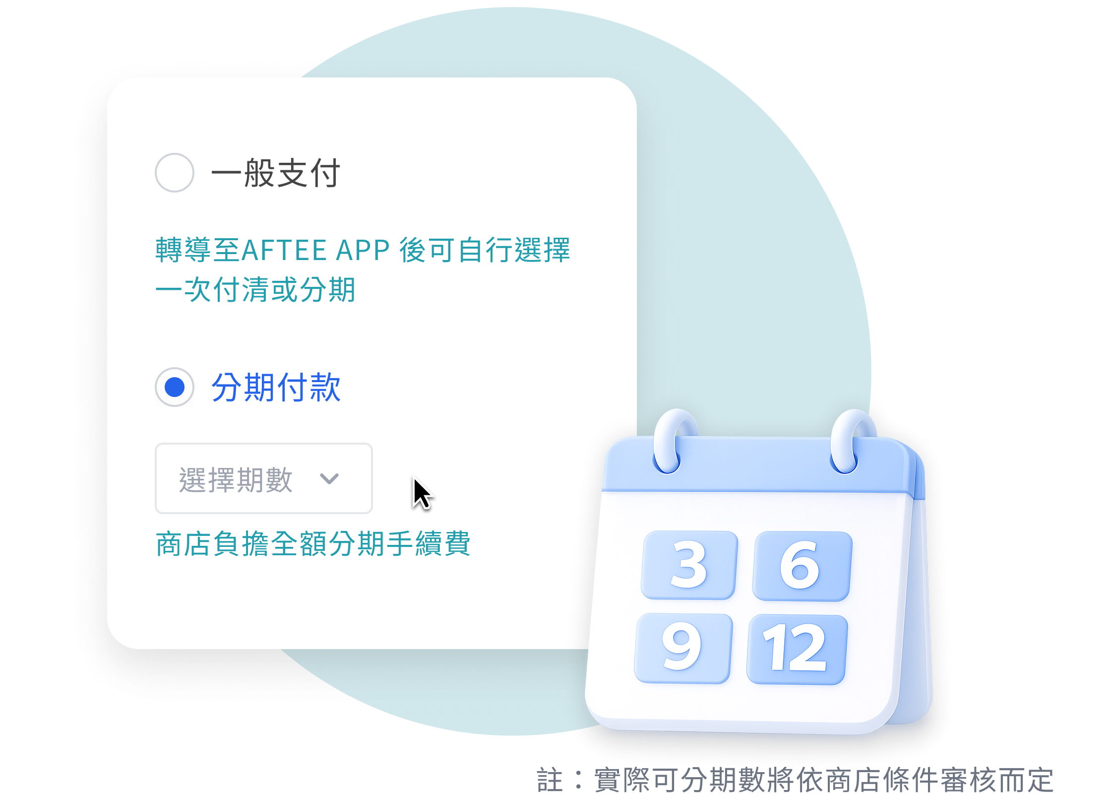 消費者於結帳時自行選擇一次付清或分期付款,且分期手續費由AFTEE向消費者收取